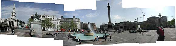The weather was starting to clear up and we were feeling pretty energetic, so we decided to walk down to the river and see the Millennium wheel (we heard about it on the Discovery Channel). Trafalgar square was on the way, so we stopped there for a bit to relax. Randy decided to put his panorama software to the test with a multi-panel picture from one side of the square to the other. Check out the bottom of the page for the results. |