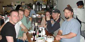 We headed to the Westminster station for the ride home. It's one of the new updated tube stations, and it's quite impressive. The hallways are much larger, and there is a very industrial "bolted metal plate" feel to it. After a short nap, we walked back down to Leicester Square and headed for "All Bar One". Julia was waiting at the door with a big grin on her face. The bar was very crowded, but she and Rick did their best at catching up. We also found out that three other friends from San Francisco (Dana, Bruce and Fred) were in town for the weekend on their way to Amsterdam. They arrived a few minutes later and we all chatted for a while over some drinks. Julia then lead us off through Soho to a great sushi place named "Yo! Sushi". The place has a huge winding conveyor belt about four inches wide which wraps around the seats. There is a continuous stream of small dishes going by, you just pick up what you want and they tally up your bill at the end based on the number and color of the plates. Pretty cool system!