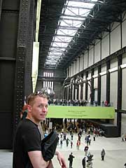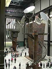 After one more shopping stop at a store named "Expectations", we took the tube to one of the newest stations, Southwark (pronounced "Suthuk"), which was very impressive. Lots of shafts running up to the surface letting light in. As we walked towards the museum, we could see that there was quite a bit of foot traffic, but once we got inside we found that it was crowded, but not mobbed. We could only imagine what it would be like over the weekend! The interior of the museum is amazing. It's built in an old power station, and the scale of the building is massive. One third of the building is an open space, where the turbines used to be.