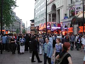 Saturday morning we lounged about in bed for a few hours before finally getting up around noon and heading out for breakfast. We had been told that there was an Internet cafe located in a nearby department store which had laptop connections. We decided to eat in the store's restaurant (which was actually quite tasty), and then attempt to upload the pages for day's 6 to 8. Unfortunately, what they meant by a "laptop" connection was a phone jack. Even covertly connecting to an ethernet drop under the counter didn't help, as we had no way to get an IP address. Oh well, back to the hotel to do the upload with an international call back to the US at 9600 baud... We slept for a while and received a call from Rick's friend Julia inviting us to dinner. We headed out around 7:30, to meet them in Leicester Square at 8pm. Leicester Square on a Saturday evening at 8pm is a complete zoo. We all decided to go somewhere less crowded, so we hopped on the tube to Islington in Northern London.