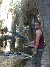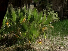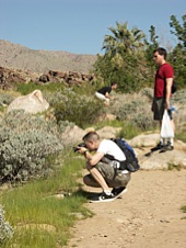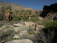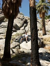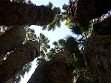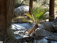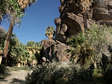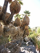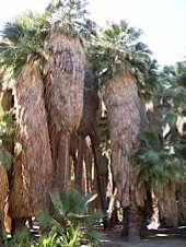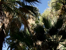 Awake at 6am again, we showered and packed, then checked out. We drove next door and ate at Elmers. Then a short drive to the North we entered an Indian reservation and drove to the start of the Andreas Canyon trail. It was a mile long trail that Rick had picked out the night before. The trail followed a small stream coming down out of the mountains, with gigantic palm trees crowded along the banks. Factmo told us that it was the densest palm grove canyon anywhere in the United States. |