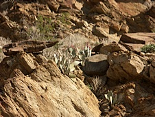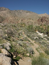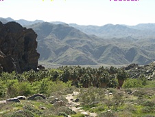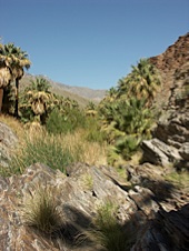 We walked leisurely along the trail, taking lots of pictures. On the return part of the loop we got a great view of the valley below. The hike only took us about an hour and a half, so we decided to drive a bit further into the reservation and try the Palm Canyon trail. It had groves of palms along the way, with a bit more elevation change than on our previous hike. |