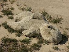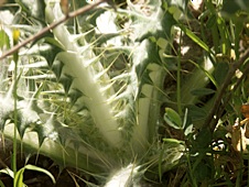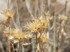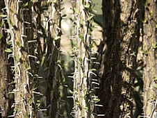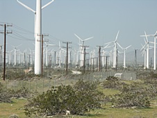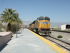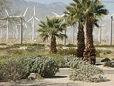 On the way to the Palm Springs Tram we stopped at a huge windmill farm, just off Interstate 10. There were hundreds of them, some spinning, others stopped. There was a train station near where we were taking pictures, and two freight trains passed us, from opposite directions. We walked through a hole in a chain linked fence to get a better view of the windmills and started to get a closer look at the desert that was all around us. A few dozen pictures later we headed back onto the road. (And that cable crossing marker post was bent before Randy drove anywhere near it!) |