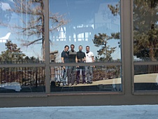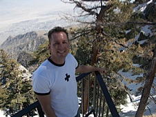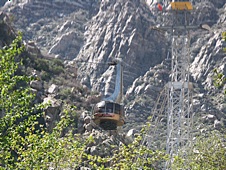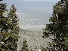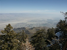 Our second adventure of the day was the Palm Springs Tram itself. It's a 30+ person capacity gondola that goes to the top of one of the nearby mountains. The cool thing about it is that it's round and the floor rotates as the gondola ascends so you get to see in every direction. As we went past each tower, the car swayed from side to side, making everyone yelp. Kind of disconcerting at first, but it was fun. At the top of the mountain the temperature was about 50° and there was snow on the ground! We walked around for a bit and took pictures. There was a tree filled valley on one side of the tram station and a patio overlooking Palm Springs on the other. Then we hopped back on the tram back down to the bottom. |