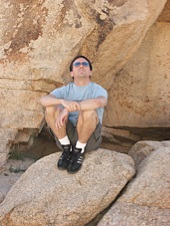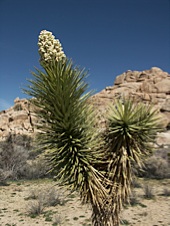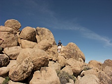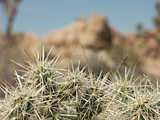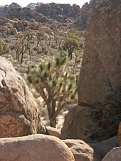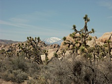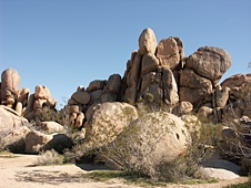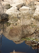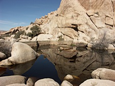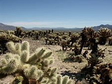We drove out to Interstate 10 and then North to Joshua Tree national park. We entered through the West entrance and immediately saw lots of Joshua Trees all around. We stopped at a big rock that some people were climbing and looked around. Then we went to a trail that led to the Baker Dam. It was about a mile hike, over easy terrain. We all had cameras and took our time along the trail, snapping some great photos. The small lake behind the dam was really beautiful, calm as glass and showing a perfect reflection of the rocks on the far side. A great photo op. Then we continued on the trail back to the parking lot. Back in the car we drove through the rest of the park, marvelling at the way the vegetation changed from one area to another. We made another stop at a big field of cholla, a kind of cactus. There were thousands of them, but only in a relatively small area of the valley. |