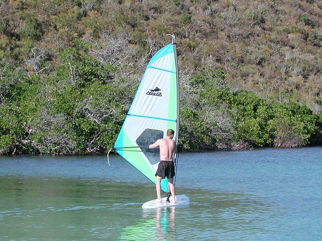 A quick nap, then down to the beach to relax, read and get some sun. We floated for a while on some lounge cushions, and Rick even gave sailboarding a try, even though there wasn't really enough wind for it, so he ended up in the trees to one side.
