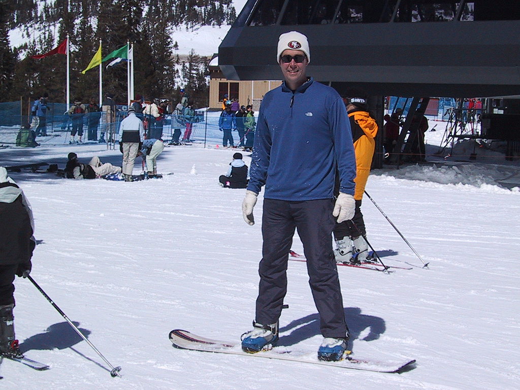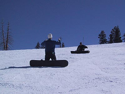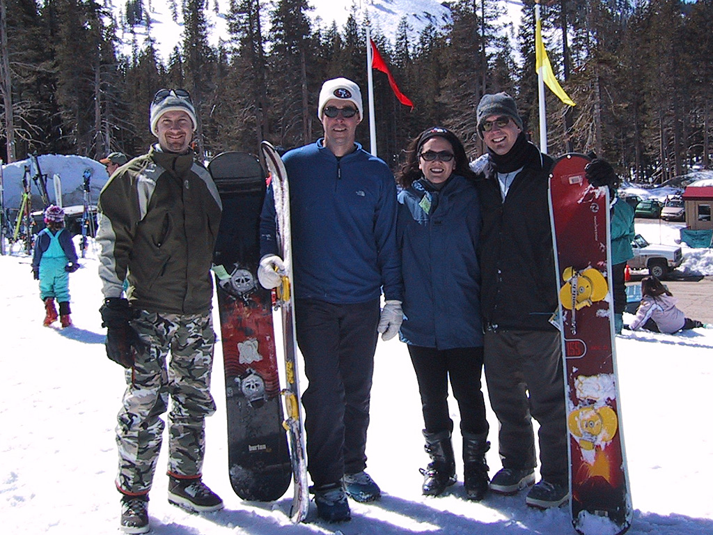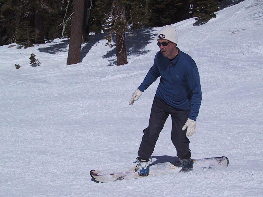Sunday morning we got up early and left the house around 8:30, headed for Sugar Bowl. The weather was even better than the day before, not a cloud in sight. Rick and Michael tried snowboarding. We all headed to a relatively easy slope for them to practice on, and Randy made sure to get some good action photos. The crowds weren't too bad, and we all had a good time. We left a little early to beat the traffic coming home, arriving back in Los Altos before 5pm. All in all, a fantastic weekend! |